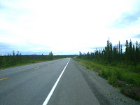 It actually didn't take that long to find a ride and after another half an hour of eating all the lollipop ladys stash of bluberries I was asked by a nice couple from Saskatchewan if I wanted a ride to Tok some 90 miles away.I said sure and they loaded all my stuff into the back or their old Suburban and we were off,behind the pilot car for a very slow ride on a very rough dirt road.We passed three more sections of dirt and each were rougher and wetter than the last and I was thankfull for the ride as it would have taken a long walk, pushing my bike through those sections to get to Tok in a couple of days let alone that day and that would have been if they let me through with my bike in the first place.